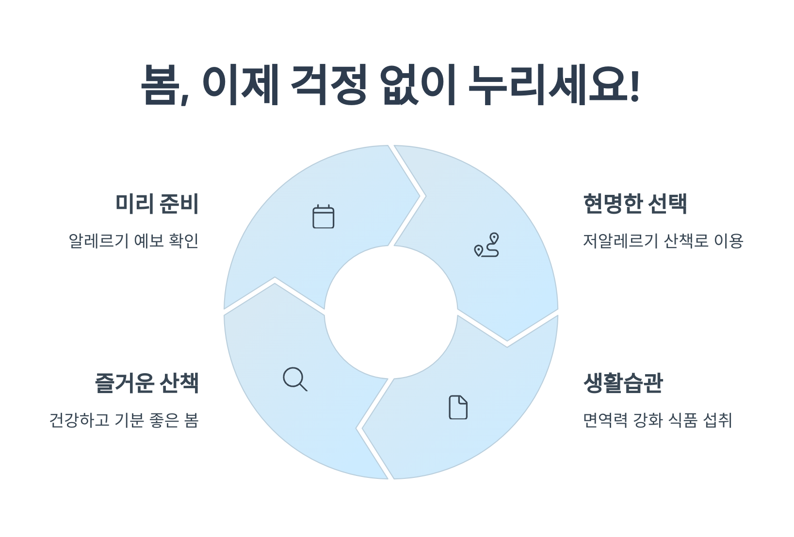봄철 알레르기, 미리 준비하고 올바른 산책법을 실천하면 더 이상 두렵지 않습니다. 알레르기 예방은 생활습관과 작은 실천에서 시작됩니다. 오늘부터 소개한 팁을 실천하며, 건강하고 기분 좋은 봄 산책을 즐겨보세요!