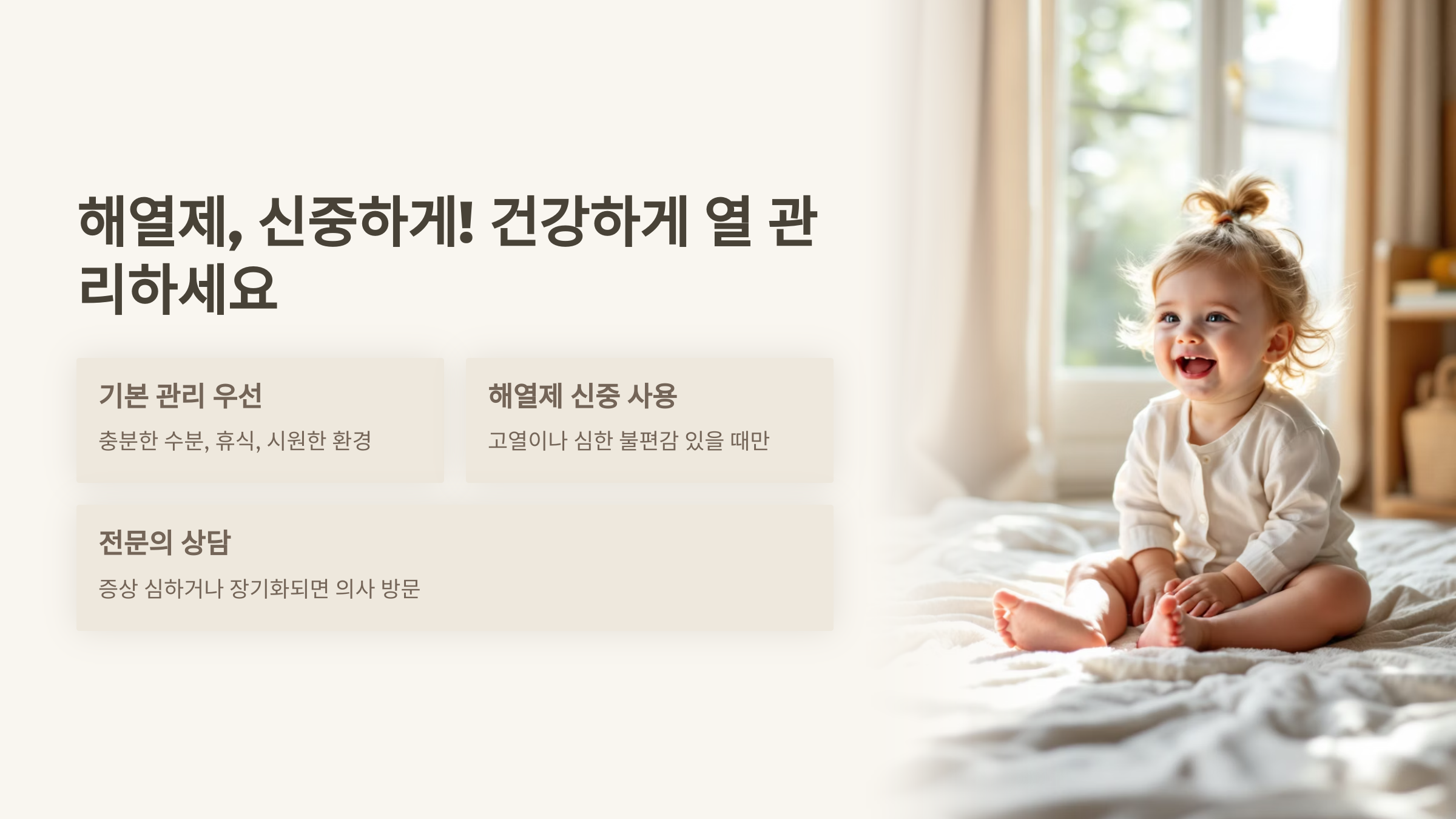 해열제는 고열이나 심한 불편감이 있을 때만, 정해진 용법대로 신중하게 사용하세요.