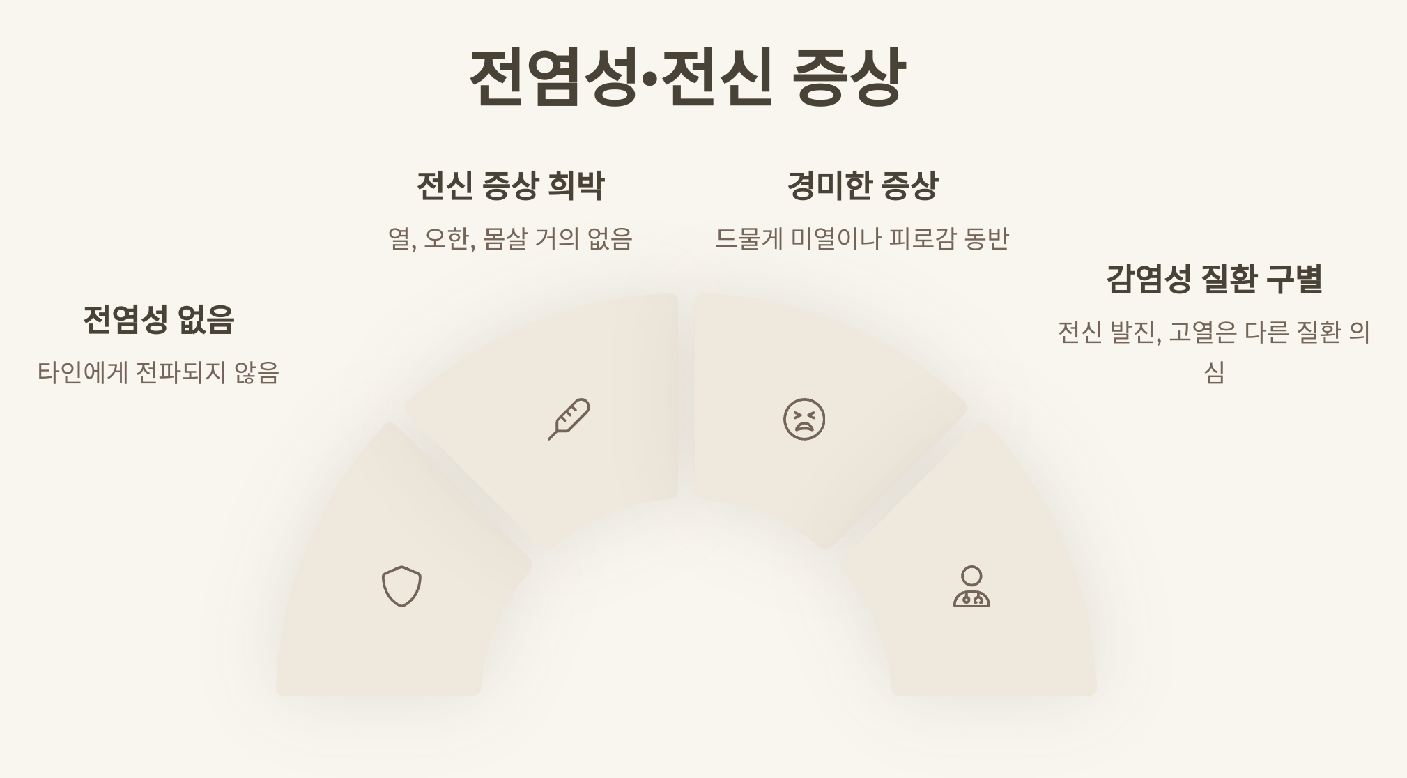 4️⃣ 전염성·전신 증상: 전염성 없음, 전신 증상 거의 없음