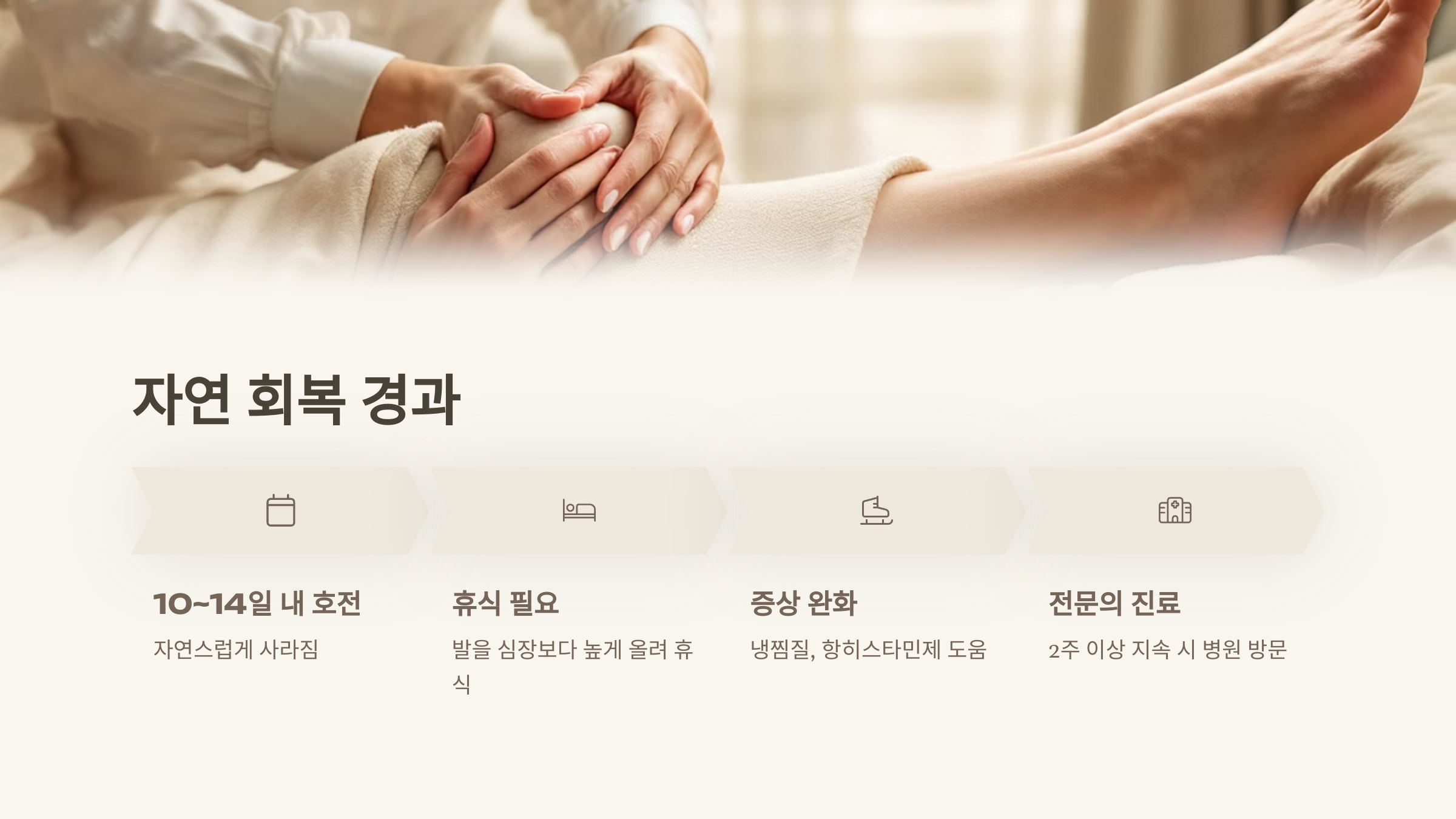 A. 활동 중단, 휴식, 수분 섭취, 다리 높이기, 냉찜질 등 기본 관리를 실천하세요.