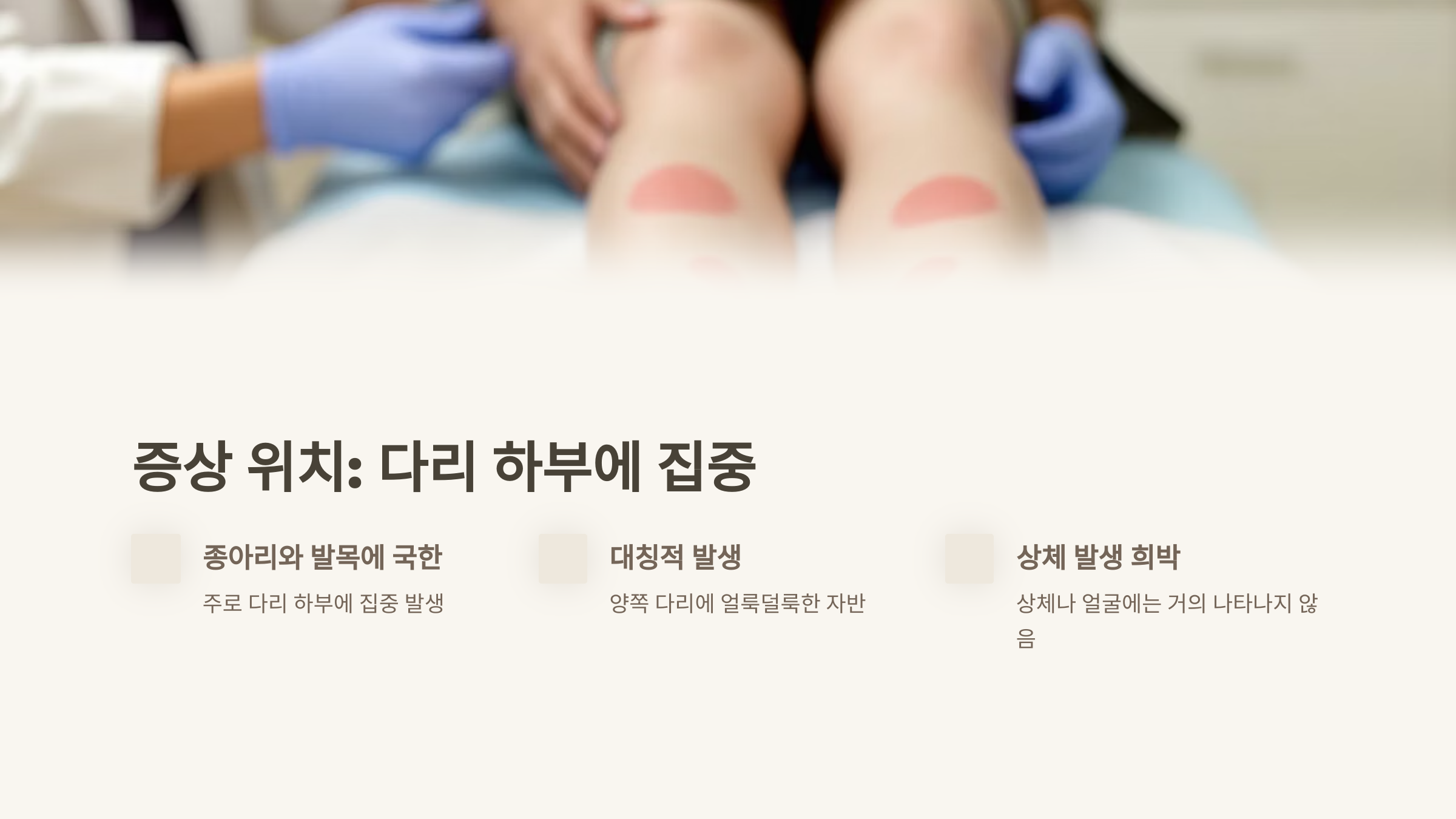 - 양쪽 다리에 대칭적으로 나타나며, 자외선 노출 부위에만 생긴다