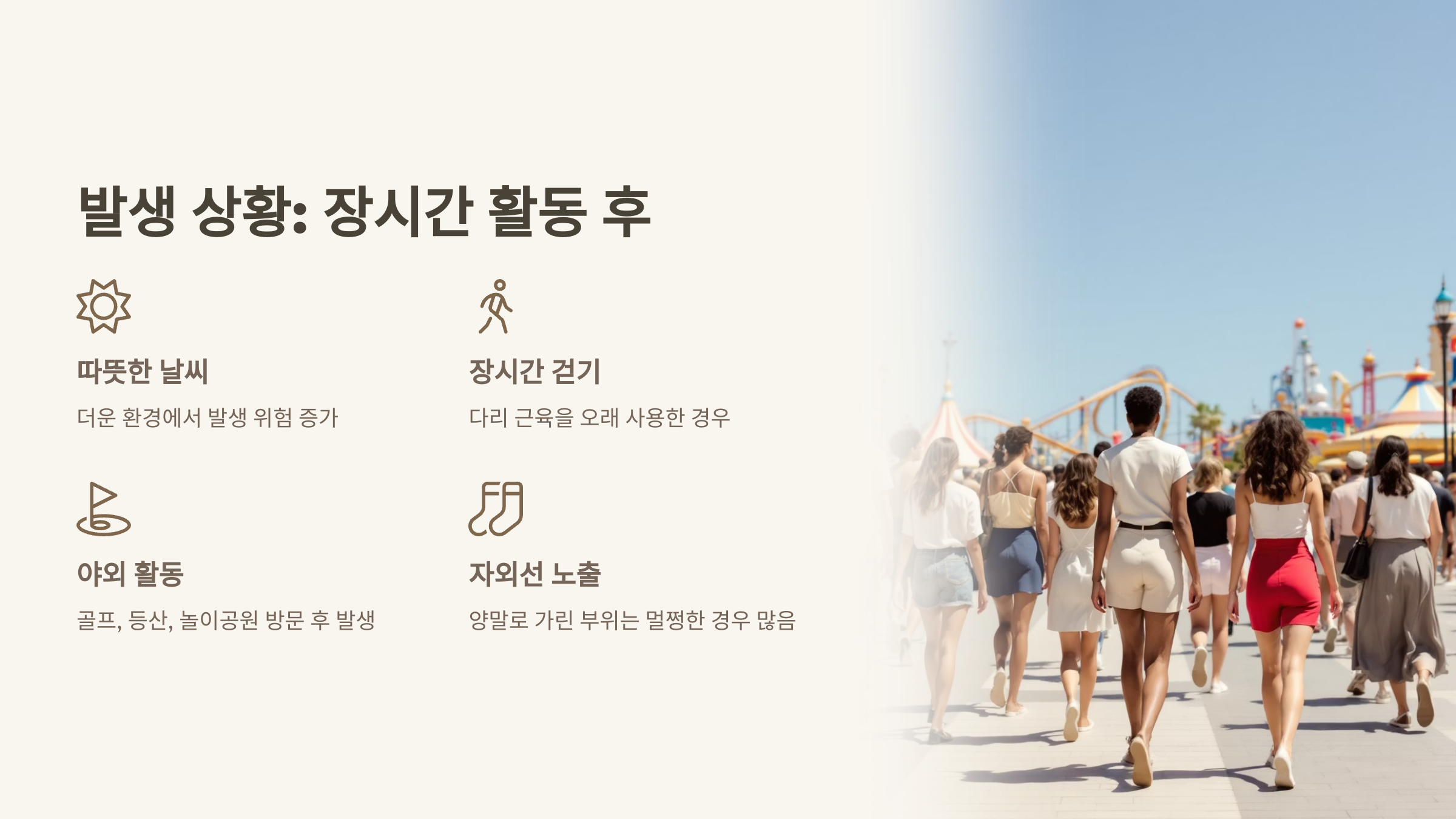 • 골프, 등산, 조깅, 놀이공원 방문 등 다리 근육을 오래 사용한 경우에 잘 발생합니다.