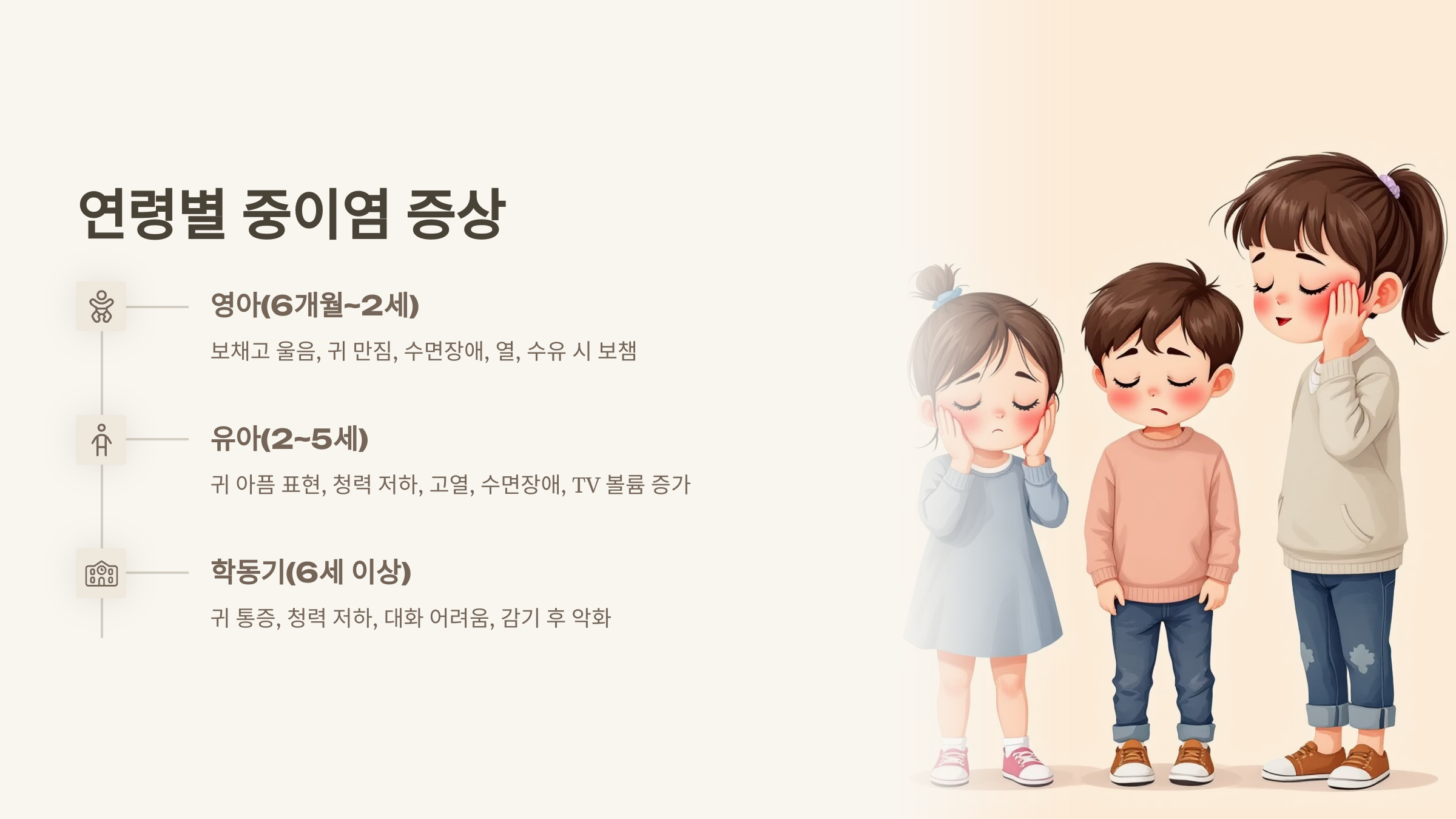 소아 중이염은 연령에 따라 증상이 다르게 나타나고, 방치하면 청력과 언어 발달에 영향을 줄 수 있는 흔한 질환입니다.