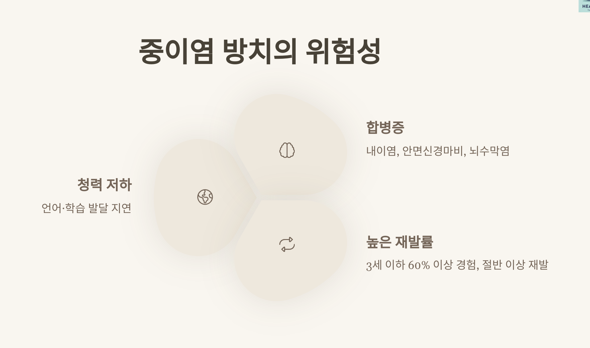 • 내이염, 안면신경마비, 뇌수막염 등 심각한 합병증 가능성
