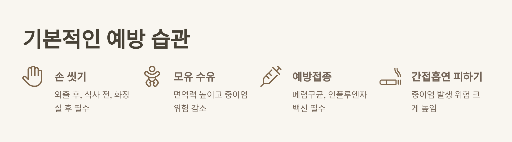 손 씻기와 예방접종이 가장 중요합니다. 감기와 중이염을 동시에 예방할 수 있습니다.