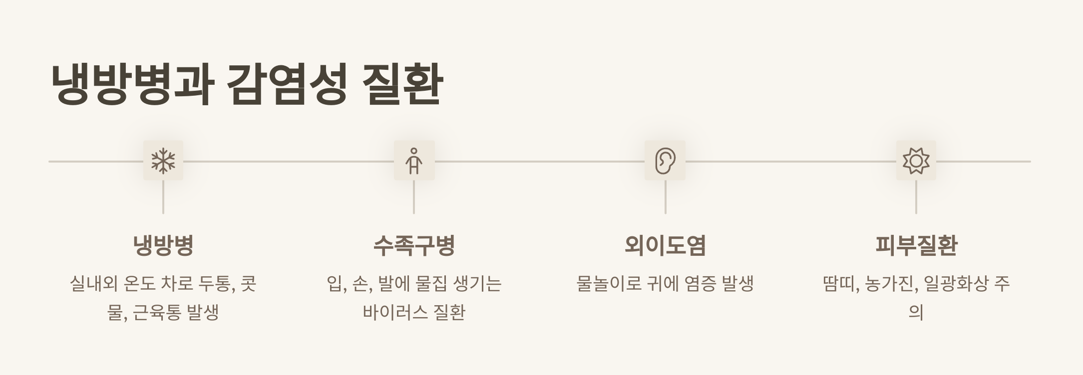 이러한 질병을 예방하기 위해 충분한 수분 섭취, 위생 관리, 적절한 실내 온도 유지, 자외선 차단 등 생활 속 작은 습관이 무엇보다 중요합니다.
