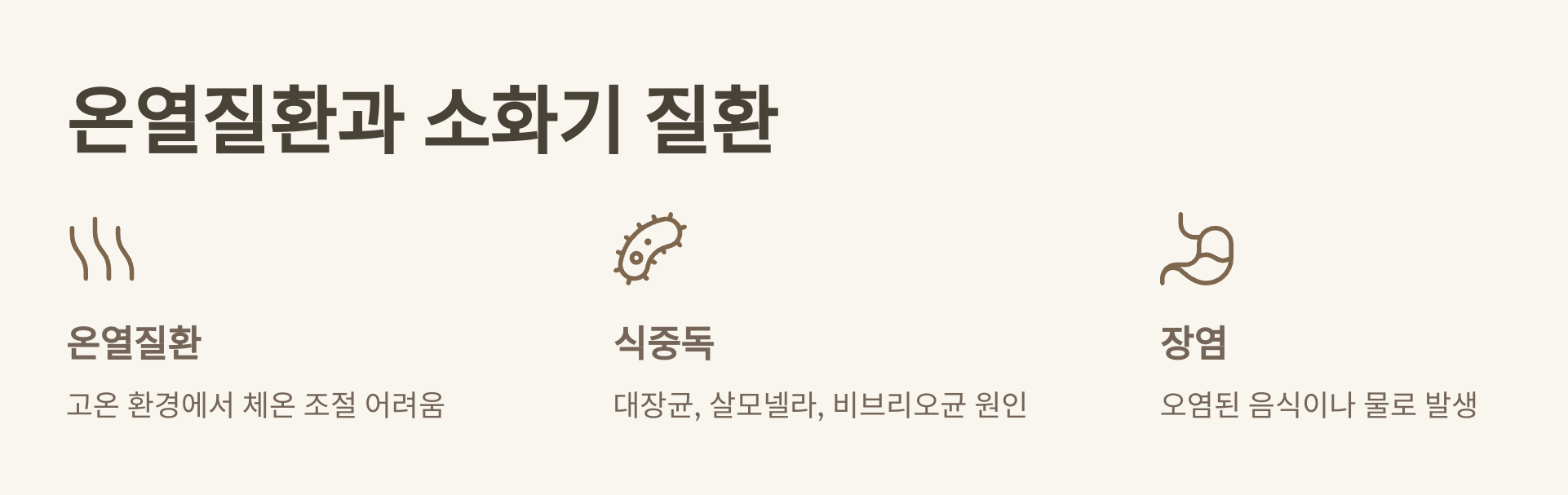 특히 고온다습한 환경급격한 온도 변화, 오염된 음식과 위생 문제로 인해 다양한 질병이 쉽게 발생할 수 있습니다.