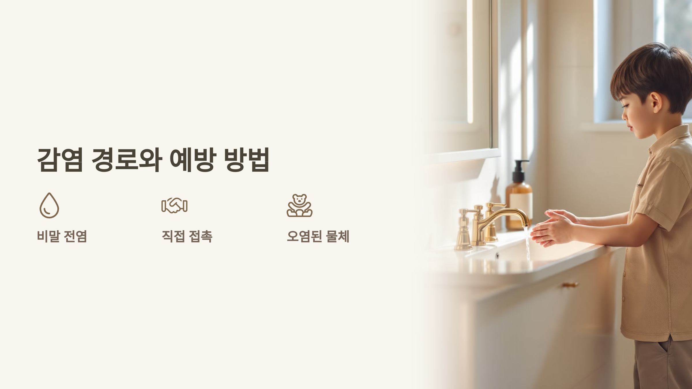 - 오염된 물체: 바이러스가 묻은 장난감, 책상, 문 손잡이 등을 만진 후 얼굴을 만질 때 전염.
