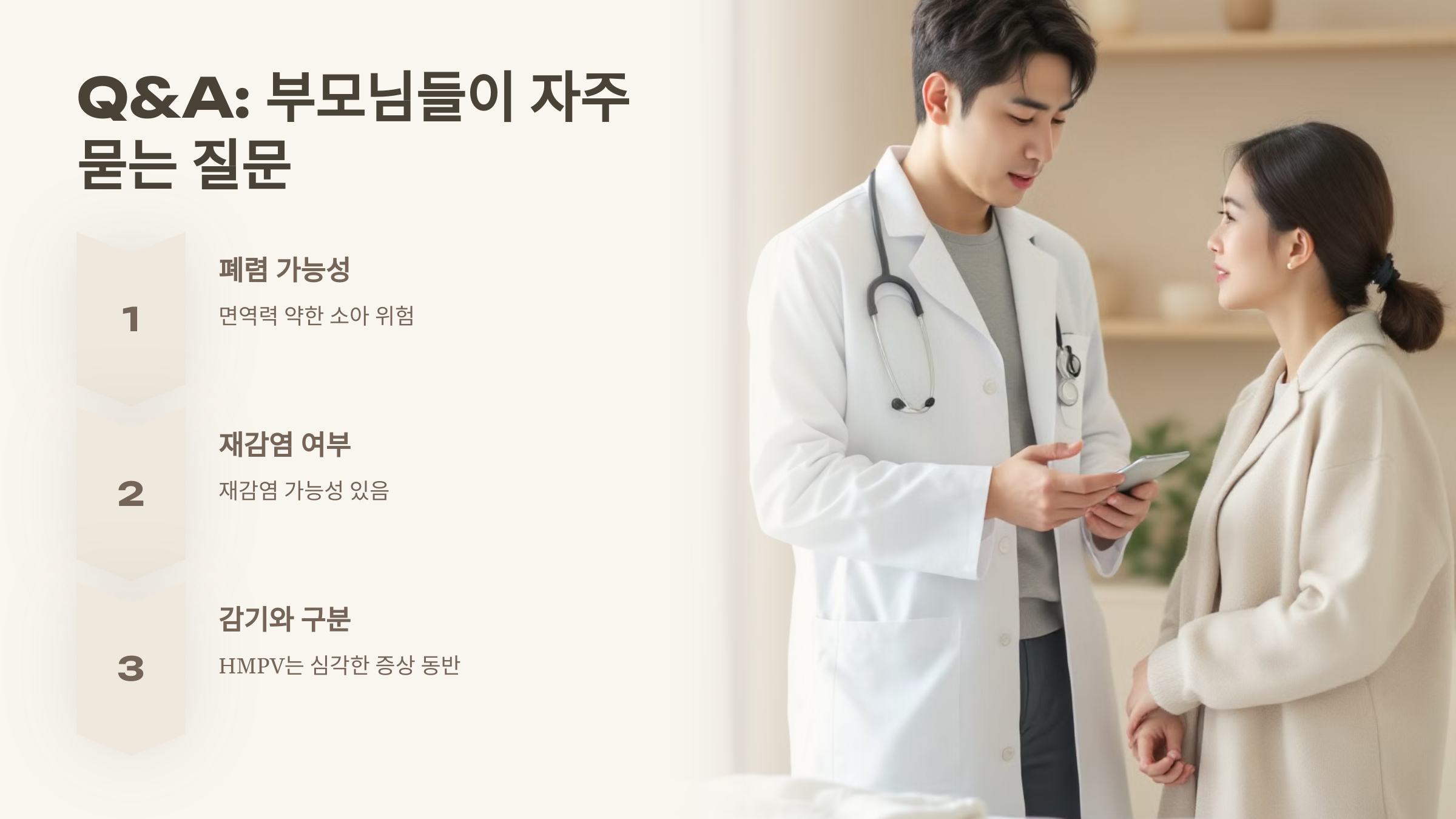 A: 네, 다른 호흡기 바이러스처럼 HMPV도 재감염 가능성이 있습니다. 특히 면역력이 약할 경우 더욱 취약합니다.