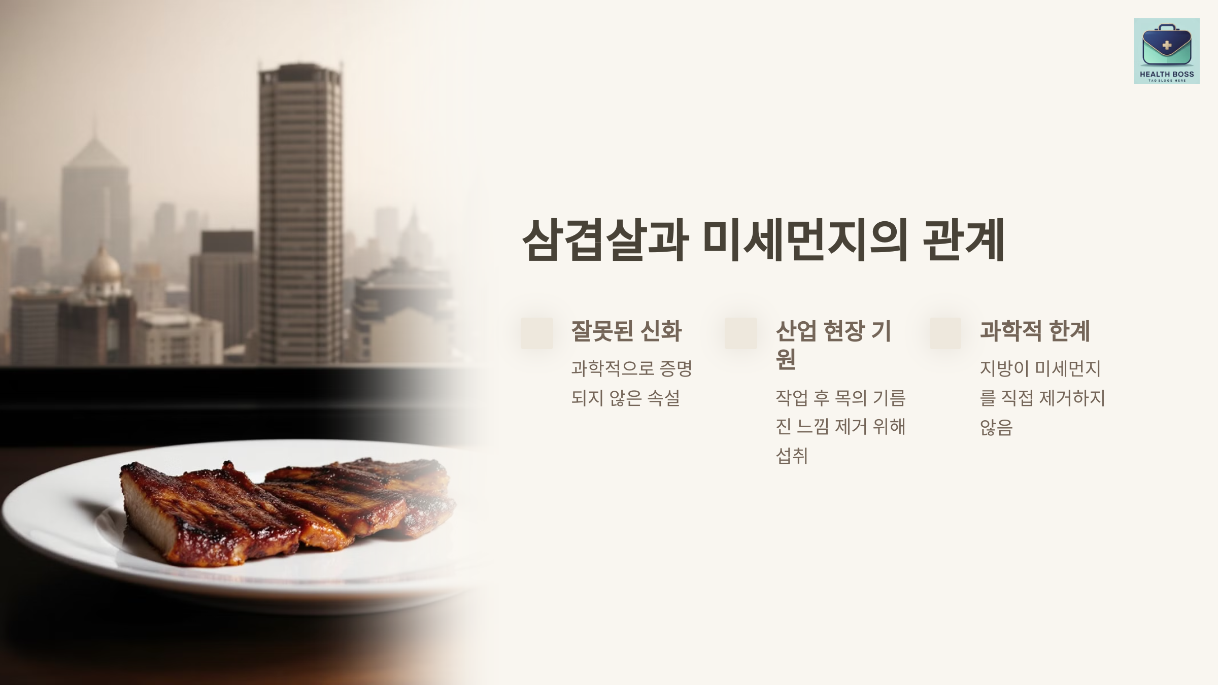 삼겹살이 미세먼지를 씻어낸다는 주장은 오랜 시간 동안 사람들 사이에서 널리 퍼져 있지만, 이는 과학적으로 증명되지 않은 속설입니다.