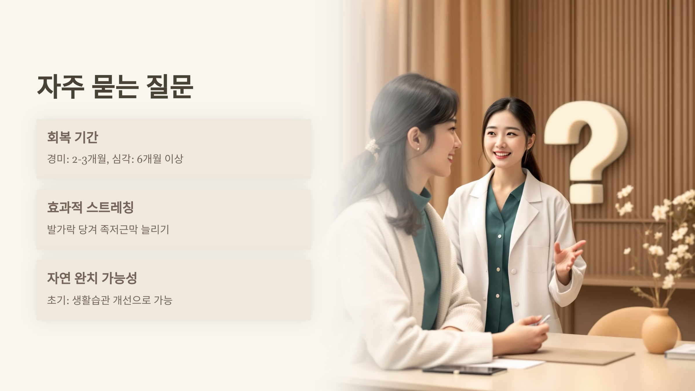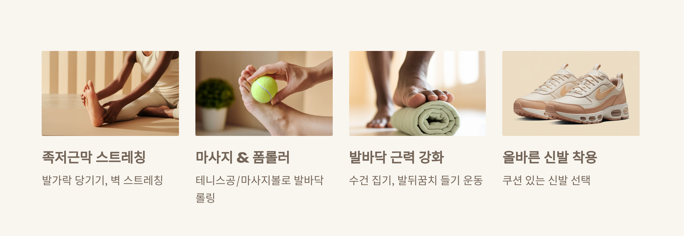 초기에는 스트레칭, 마사지, 신발 교체 등의 자연치유 방법을 실천하고, 통증이 지속된다면 병원에서 충격파 치료, 약물 치료, 깔창 치료 등을 고려하세요.