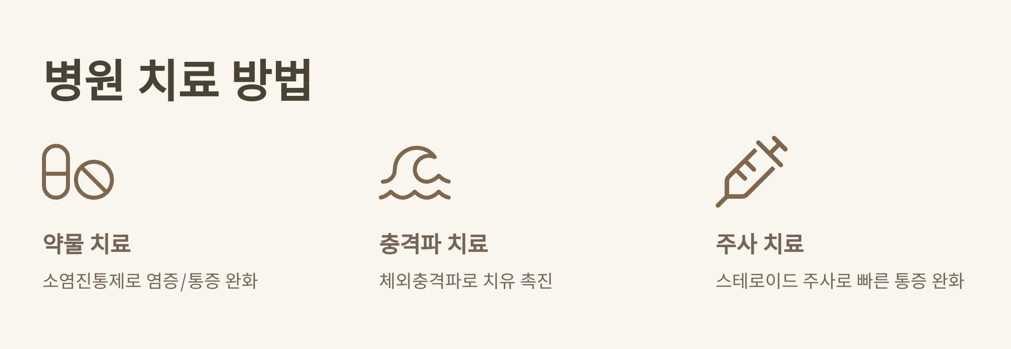 | 충격파 치료 | 중기~심한 경우 | 비수술적 치료로 효과적 | 치료 후 통증 가능 |