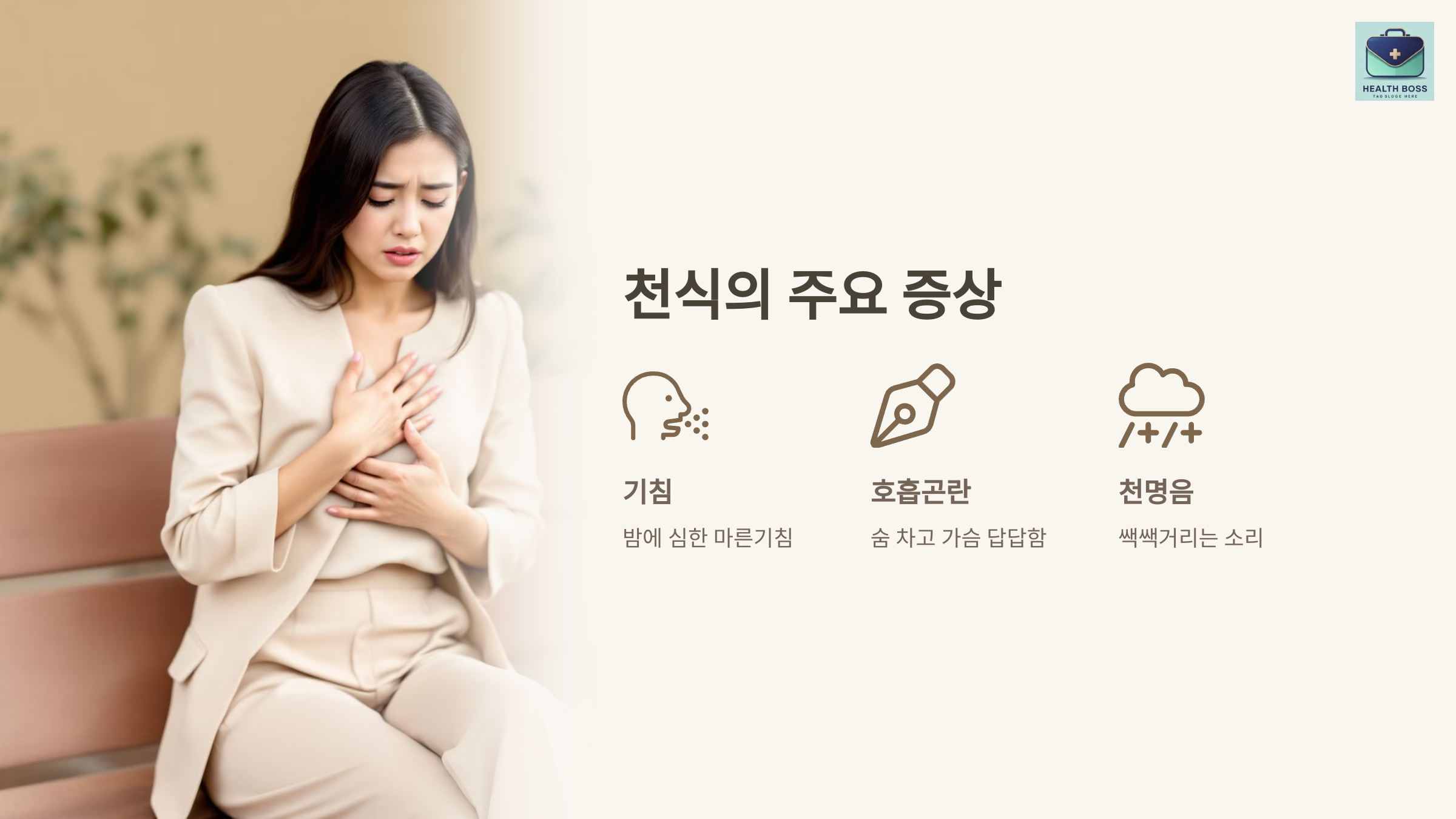 📢 TIP: 위 증상들이 반복되거나 밤에 심해지는 경우, 천식을 의심하고 병원을 방문하는 것이 중요합니다.