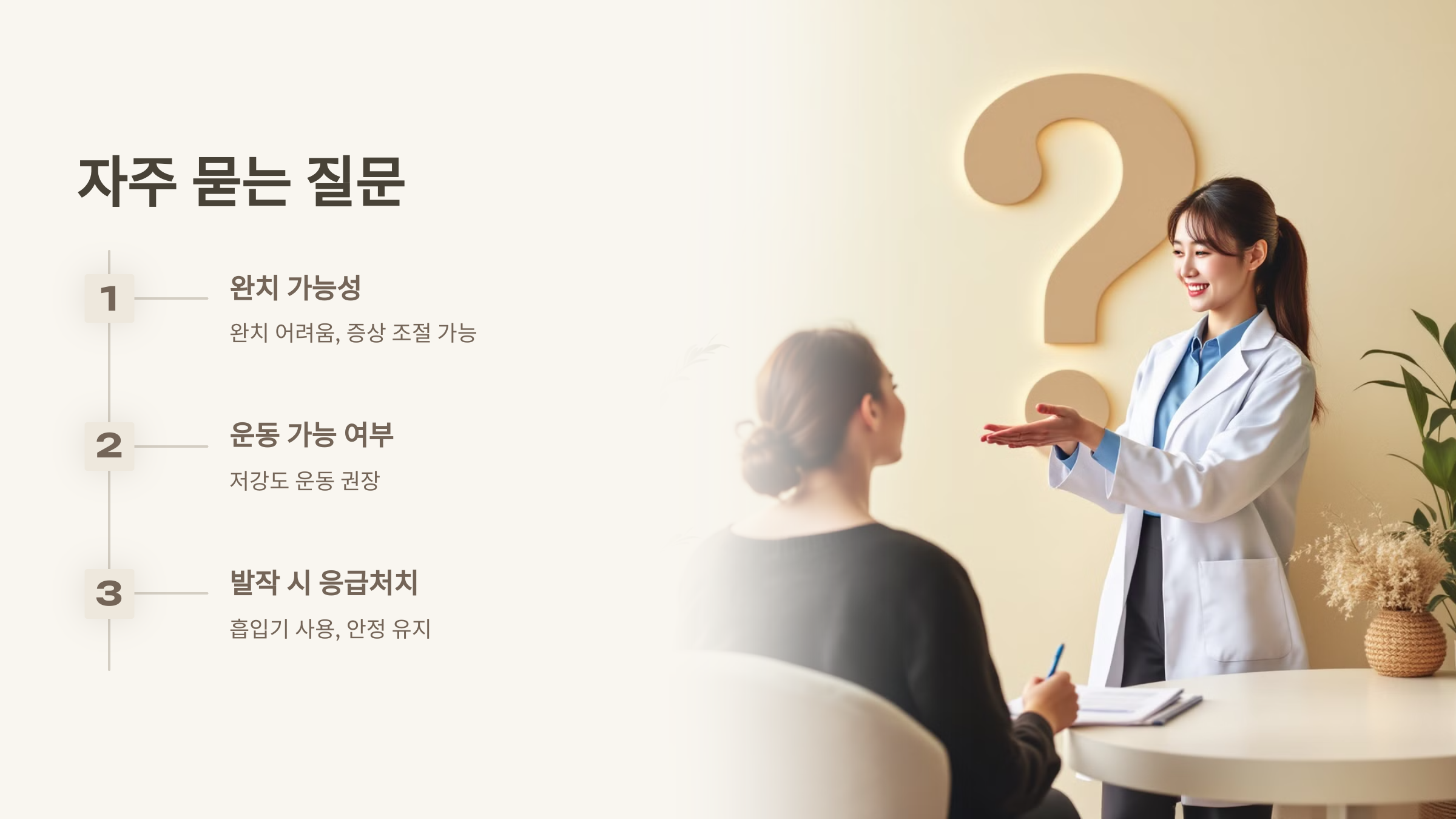 📢 TIP: 천식은 완치는 어렵지만, 꾸준한 관리와 치료를 통해 증상을 예방하고 생활의 질을 높일 수 있습니다.