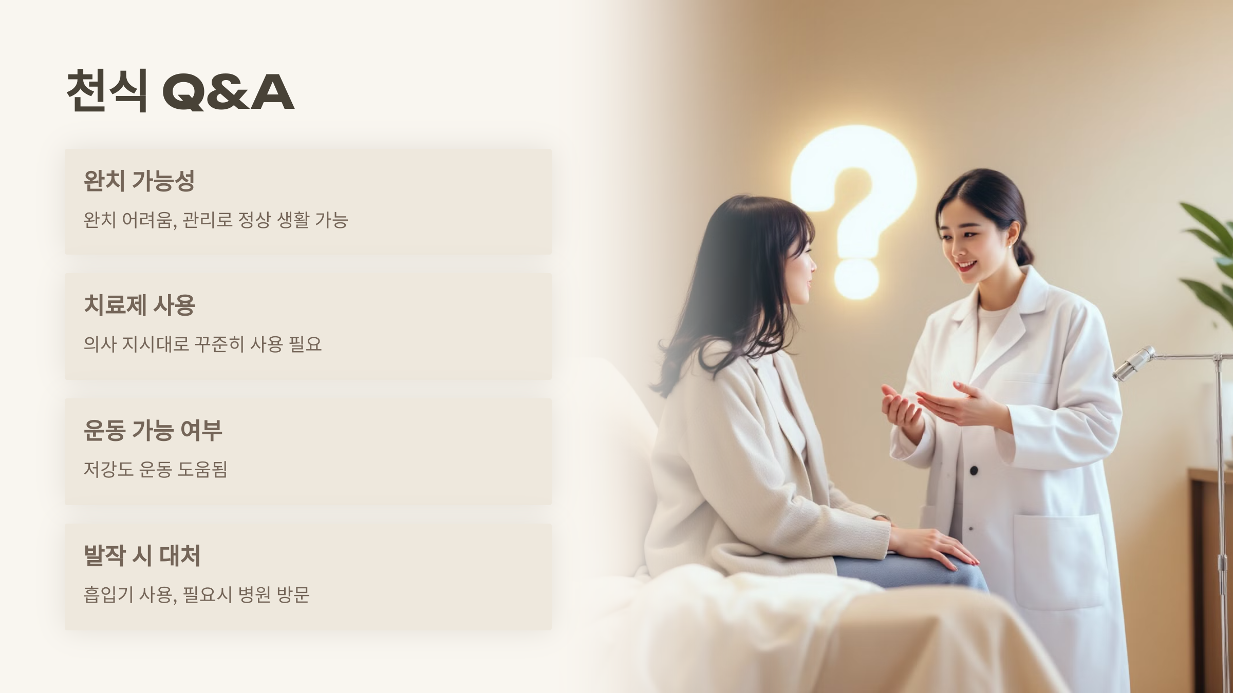 A: 천식은 만성 질환으로 완치는 어렵지만, 꾸준한 관리로 정상적인 생활이 가능합니다.