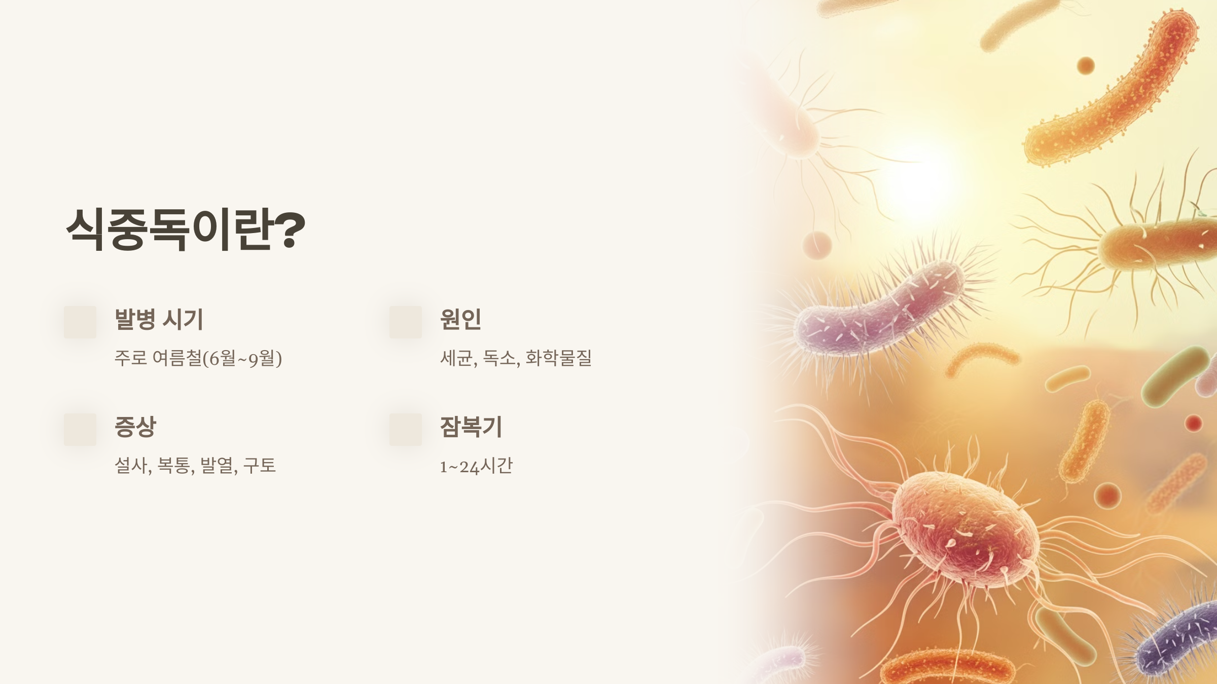 식중독은 세균, 바이러스, 독소 등 유해 물질에 의해 발생하는 질환으로,