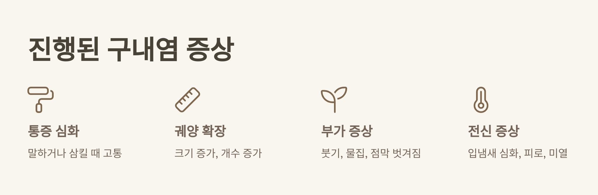 - 말하거나 삼킬 때마다 통증이 심해지고, 자극적인 음식이나 뜨거운 음식에 더욱 민감해집니다.